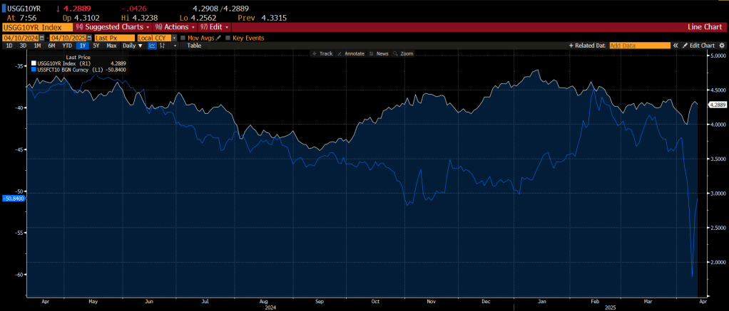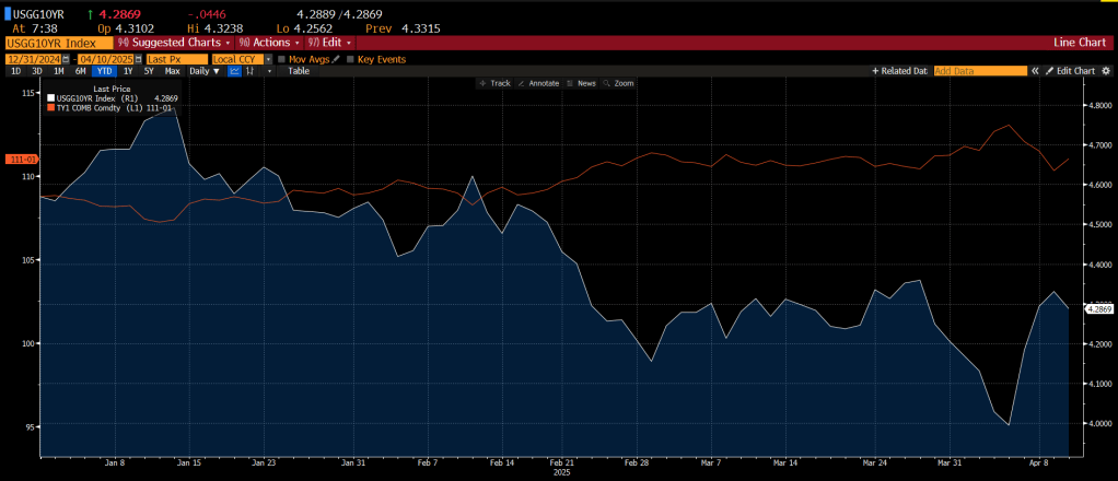 Bloomberg Terminal. USGG10YR Index (10-Year U.S. Treasury Yield) and TY1 Comdty (10-Year Treasury Note Futures), as of April 10, 2025.