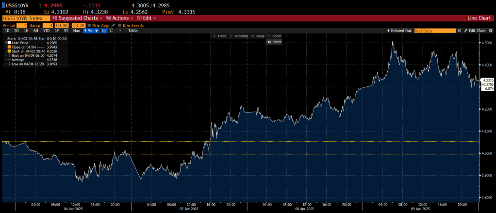 Bloomberg Terminal. USGG10YR Index (10-Year U.S. Treasury Yield) Period: 04.04.2025 – 09.04.2025