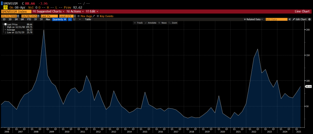 Bloomberg Terminal. SMOVEU1M Index (ICE BofAML MOVE Index – 1-Month), showing quarterly observations from January 2006 to April 2025. Last data point as of April 8, 2025
