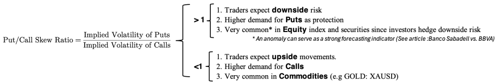 Put/Call Skew Ratio is used as a comparative metric between Implied volatilities of OTM Puts and OTM Calls to gauge market pricing.