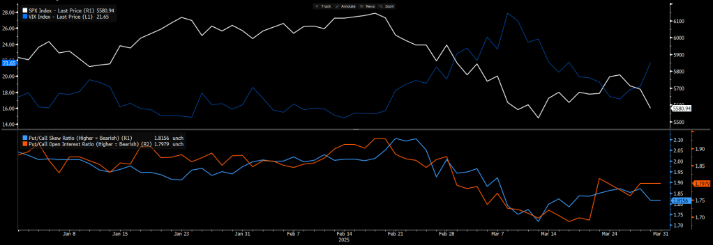 Top: SPX vs VIX 2025 YTD // Bottom: Put-Call Skew Ratio vs Put-Call Open Interest Ratio 2025 YTD (source: Bloomberg)