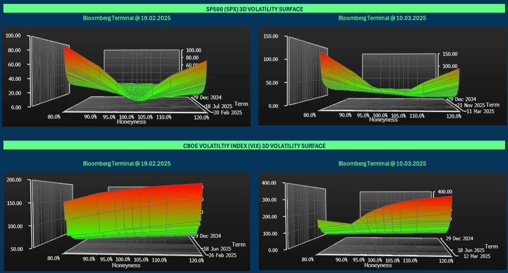 The Put/Call Skew Ratio increased significantly in February and March 2025. This steepening of the skew indicated that market participants were increasingly willing to pay a premium for downside protection, even as the market corrected. The skew rising above its historical average (e.g., skew ratios >1.3 or higher in some tenors) suggested elevated fear of tail risk, even more than what was visible in the headline VIX level.