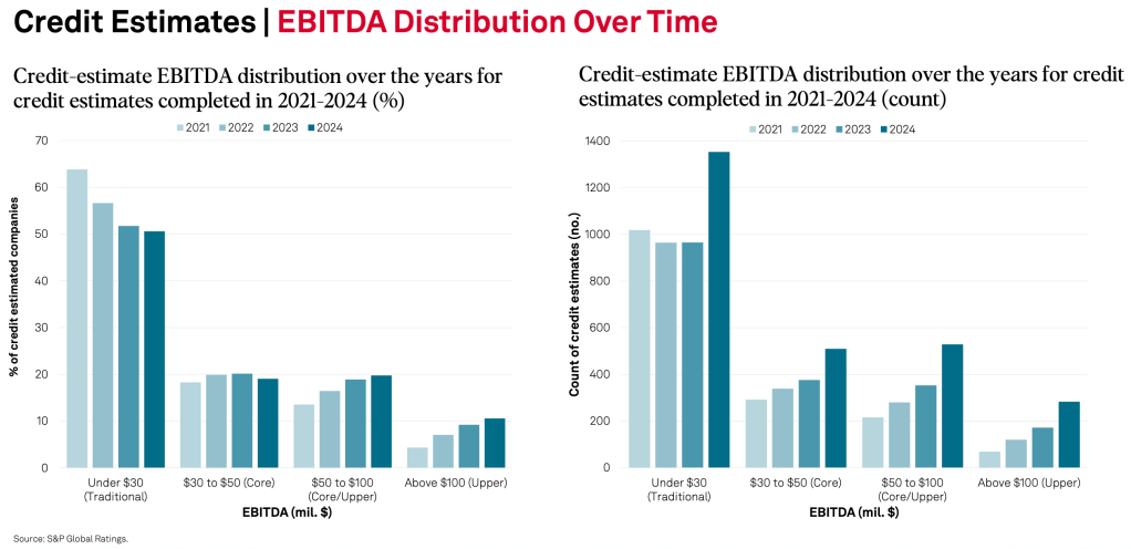 This bifurcation is visible in recent market data. As shown below, the share and volume of borrowers with $50–$100 million in EBITDA (typically the sweet spot for underwritten unitranche deals) has increased meaningfully in 2024. These borrowers are best positioned to benefit from flexible unitranche structures, while those with smaller EBITDA often face tighter terms or limited access.