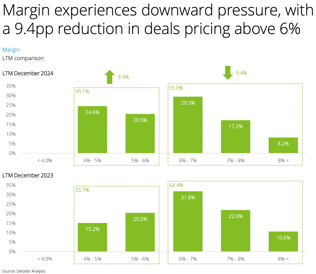 Unitranche financing has become a selective tool, rewarding creditworthy borrowers with speed and simplicity, while maintaining pricing discipline for weaker credits, as a result, private debt margins are compressing.The following chart illustrates a notable shift in private debt pricing dynamics between LTM December 2023 and LTM December 2024. Specifically, it shows a 9.4% reduction in the share of deals priced above 6%, with more transactions clustering in the 4%–6% range. Meaning, the decline in >6% pricing doesn’t mean riskier deals are getting cheaper, it means lenders are avoiding them, whereas the increase in sub-6% deals signals a flight to quality, where only resilient borrowers can access unitranche capital at scale. This supports this “selective tool” idea, capital flows to strong sponsors while riskier names are left behind or forced into higher-cost or structured solutions.