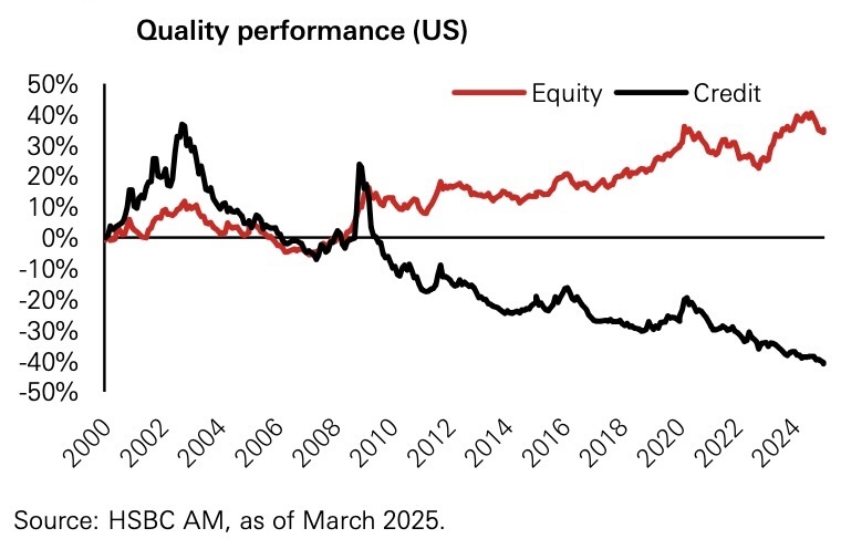 In contrast, credit markets are dominated by institutional investors (i.e pension funds, insurers, and banks) who are highly sensitive to credit risk and governed by regulatory capital rules. These investors often prefer higher-rated issuers and demand reliable interest payments, not capital gains. As a result, quality is already priced in through tighter credit spreads, leaving little room for alpha.